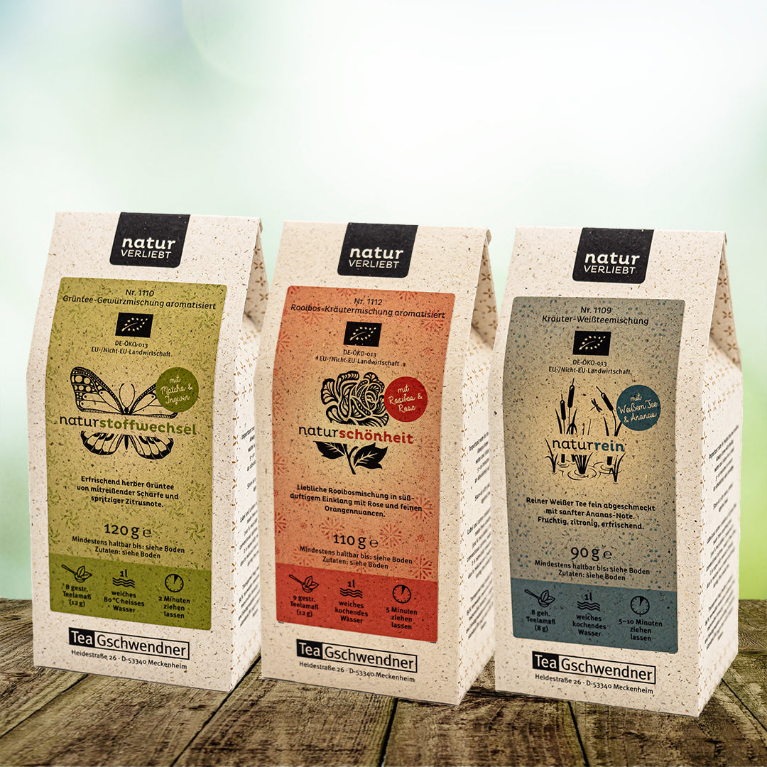 En matière d’emballage, la protection des produits est la priorité absolue de TeeGschwendner. Notre objectif est de garantir la plus grande sécurité des produits et le meilleur goût tout en utilisant les matériaux d'emballage les plus respectueux de l'environnement possible. Concilier ces deux approches constitue un défi majeur. Afin de trouver des solutions d'emballage adaptées dans un marché dynamique avec des possibilités et des développements constamment nouveaux, nous travaillons avec des partenaires renommés de l'industrie de l'emballage sur le développement d'emballages. Pour les produits pour lesquels les exigences de protection des produits le permettent, nous utilisons consciemment la possibilité d'utiliser des matériaux recyclés et recyclables. Pour un plaisir de thé responsable à chaque tasse !